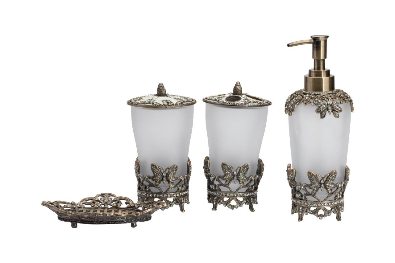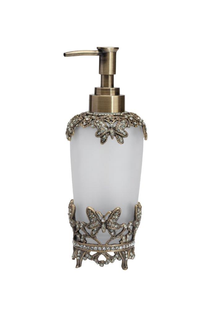 Дозатор для жидкого мыла Lisette представляет собой матовый стеклянный флакон, который сверху и снизу окантован металлической вязью в виде бабочек, инкрустированных стеклянными камешками. Благодаря изящному дизайну, удобству и простоте в использовании, является незаменимым аксессуаром в современной ванной комнате. Изготовлена из совершенно безопасных натуральных материалов. Непременно приобретите его вместе с другими предметами коллекции Lisette для вашей ванной комнаты. Такой набор, несомненно, станет и шикарным подарком.