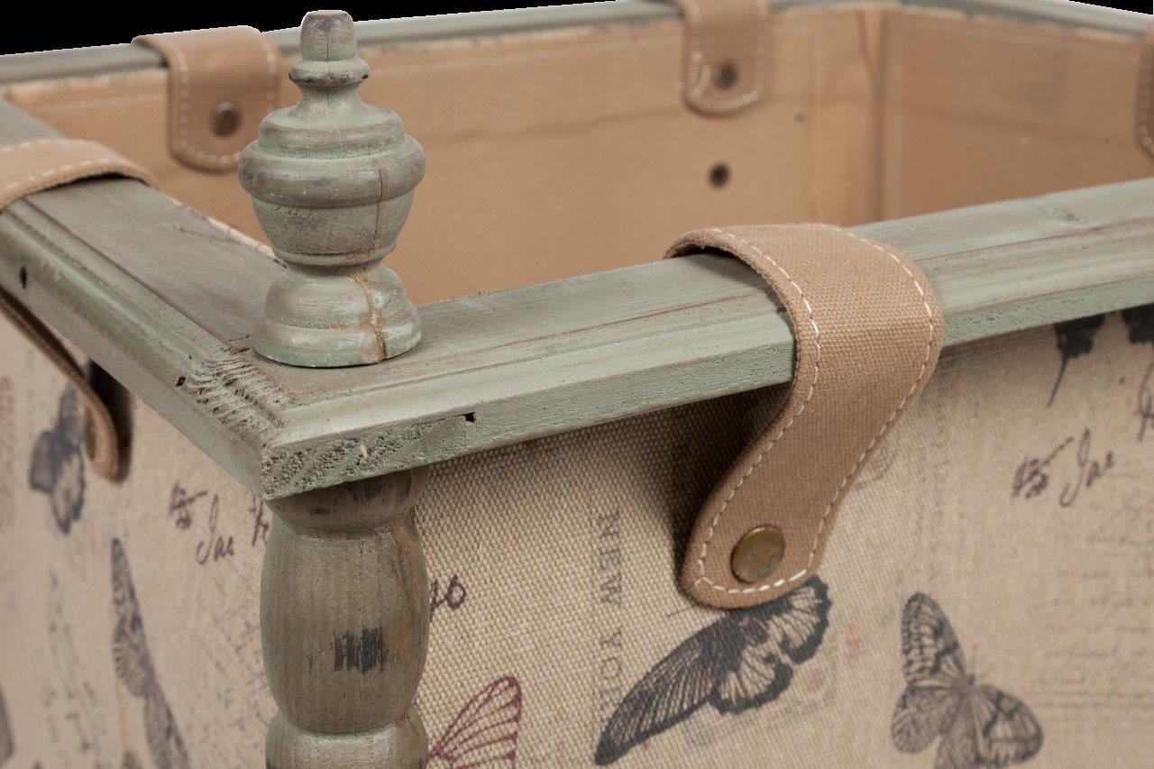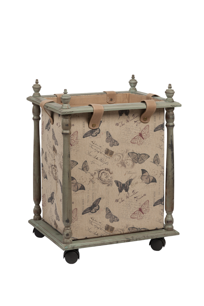 Корзина для белья с каркасом, выполненным из натурального дерева и съемной корзиной из экокожи. Главной особенностью изделия являются наличие колесиков с функцией анти-след. Корзина расписана под старину в стиле «Шебби-шик» рисунками бабочек.