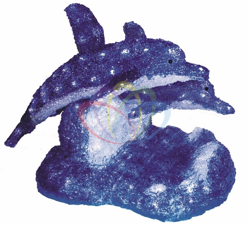 Акриловые фигуры за несколько лет вызвали большой интерес у дизайнеров и частных клиентов. С каждым годом расширяется не только ассортимент акриловых фигур, но и появляются новые технологии нанесения акрила. Эти яркие, светящиеся объемные фигуры, состоящие из металлического каркаса, акрила и светодиодов, применяются для оформления и создания новогодней атмосферы в кафе, ресторанах, торговых центрах, магазинах, на площадях и перед входом, а также просто в частных домах и квартирах. Все фигуры укомплектованы понижающим трансформатором , что обеспечивает безопасность при контактировании, а так же имеют степень защиты IP 44, что позволяет использовать их как в помещении, так и на улице. Акриловая светодиодная фигура Синие дельфины высотой 65 см, светящаяся более чем 130 ярких диодов, выполнена по специальной технологии нанесения акрила. Новинка этого сезона позволит Вам создать ту самую, настояющую новогоднюю атмосферу и принести сотни радостных улыбок.