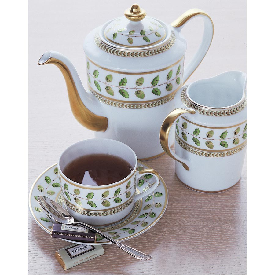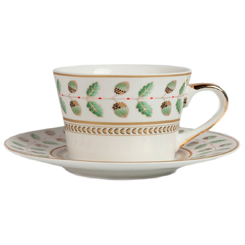 Желуди, дубовые листья, спокойная расцветка и золотая кайма — все выдаёт тонкий вкус владельца чайной пары Flober. От расцветки веет теплом, спокойствием, а тонкий костяной фарфор безупречно вписывается в любую сервировку чаепития. Современная выпечка или класическое печенье — все будет аппетитно смотреться на блюдце с таким растительным орнаментом. в нашем интернет-магазине также представлены комплекты тарелок из коллекции Flober с таким же орнаментом.