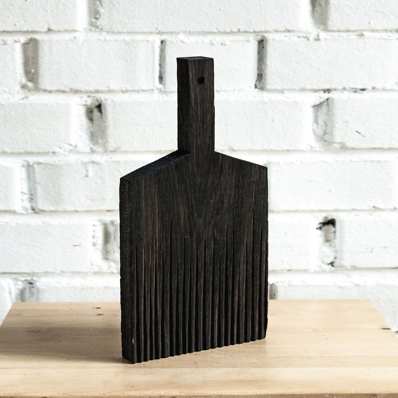 Сделана вручную. Покрытие: льняное масло. У доски есть две поверхности: декоративная с нанесенной на нее фактурой и рабочая, гладкая. Её можно использовать как разделочную, сервировочную доску для подачи или предмет декора интерьера. Из-за специфики ручного труда все предметы отличаются друг от друга. После влажной обработки доску нужно протирать полотенцем. При необходимости можно обновлять покрытие, протерев поверхность доски тряпочкой, смоченной льняным маслом.