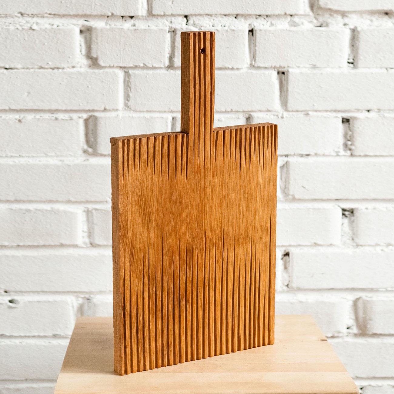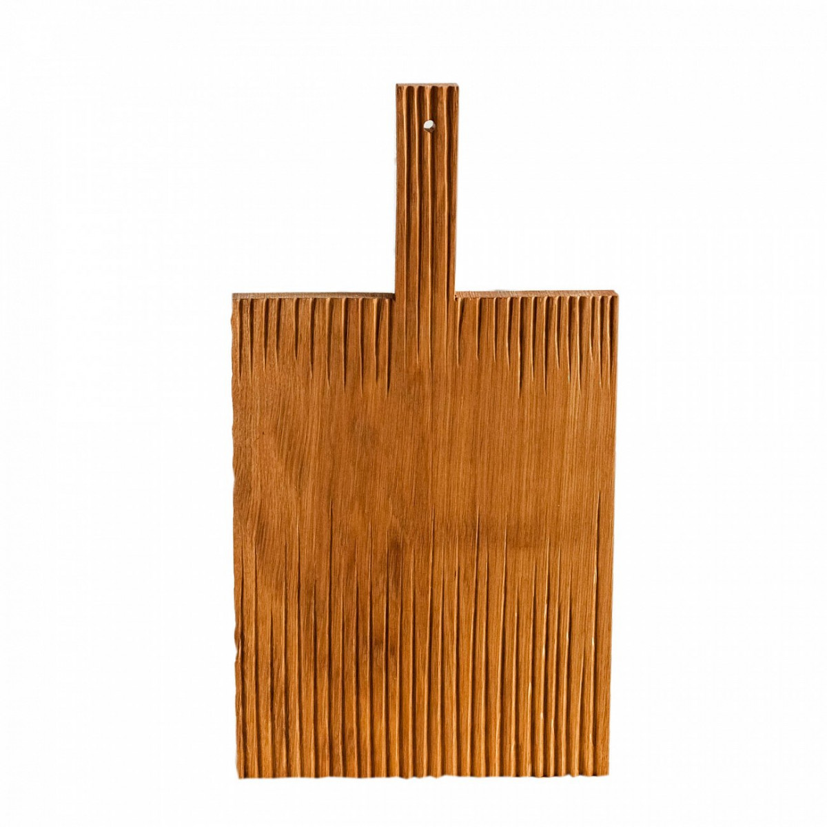Сделана вручную. Покрытие: льняное масло. У доски есть две поверхности: декоративная с нанесенной на нее фактурой и рабочая, гладкая. Её можно использовать как разделочную, сервировочную доску для подачи или предмет декора интерьера. Из-за специфики ручного труда все предметы отличаются друг от друга. После влажной обработки доску нужно протирать полотенцем. При необходимости можно обновлять покрытие, протерев поверхность доски тряпочкой, смоченной льняным маслом.