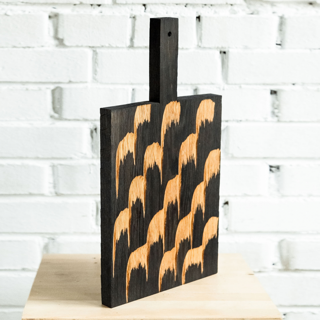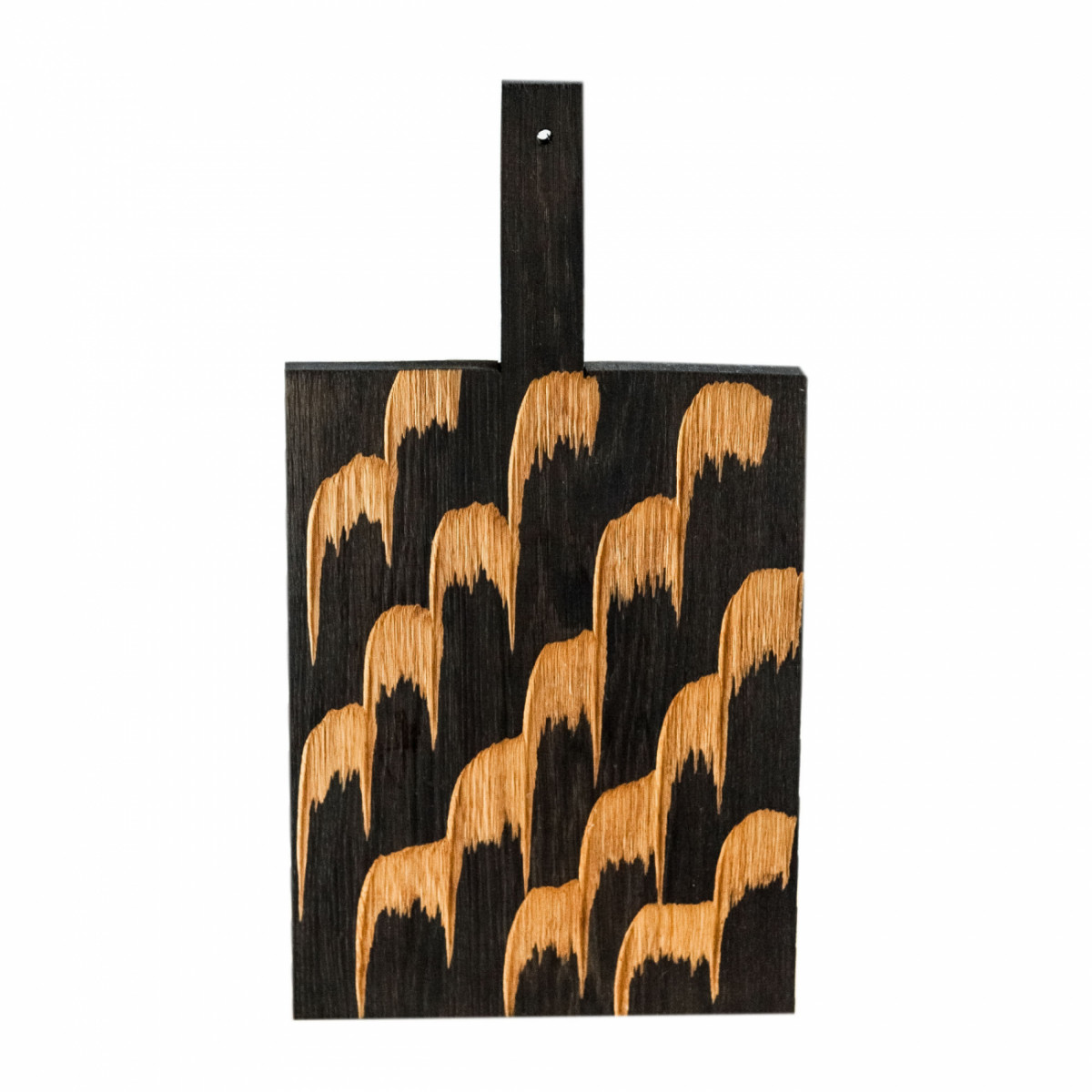 Сделана вручную. Покрытие: льняное масло. У доски есть две поверхности: декоративная с нанесенной на нее фактурой и рабочая, гладкая. Её можно использовать как разделочную, сервировочную доску для подачи или предмет декора интерьера. Из-за специфики ручного труда все предметы отличаются друг от друга. После влажной обработки доску нужно протирать полотенцем. При необходимости можно обновлять покрытие, протерев поверхность доски тряпочкой, смоченной льняным маслом.