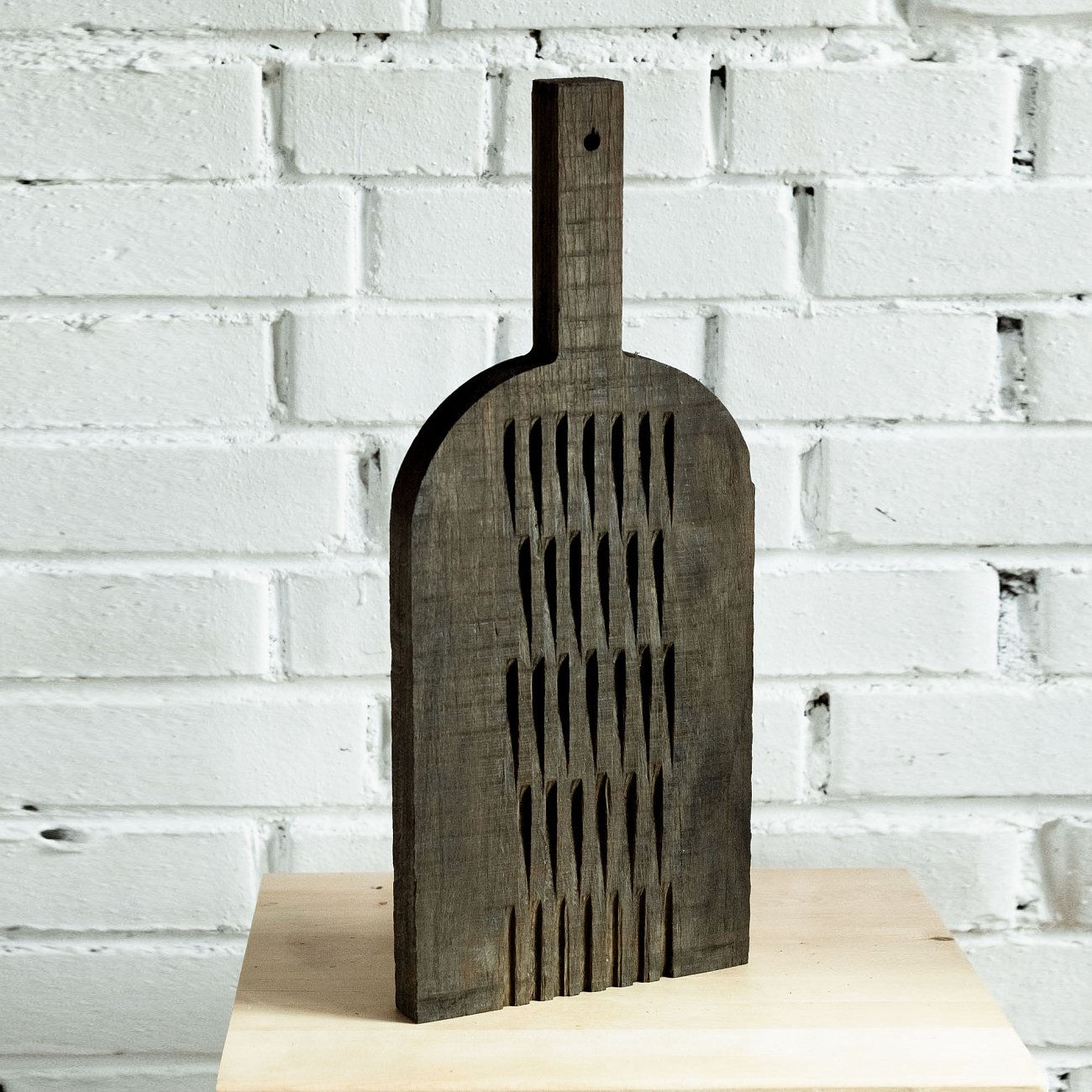 Сделана вручную. Покрытие: льняное масло. У доски есть две поверхности: декоративная с нанесенной на нее фактурой и рабочая, гладкая. Её можно использовать как разделочную, сервировочную доску для подачи или предмет декора интерьера. Из-за специфики ручного труда все предметы отличаются друг от друга. После влажной обработки доску нужно протирать полотенцем. При необходимости можно обновлять покрытие, протерев поверхность доски тряпочкой, смоченной льняным маслом.
