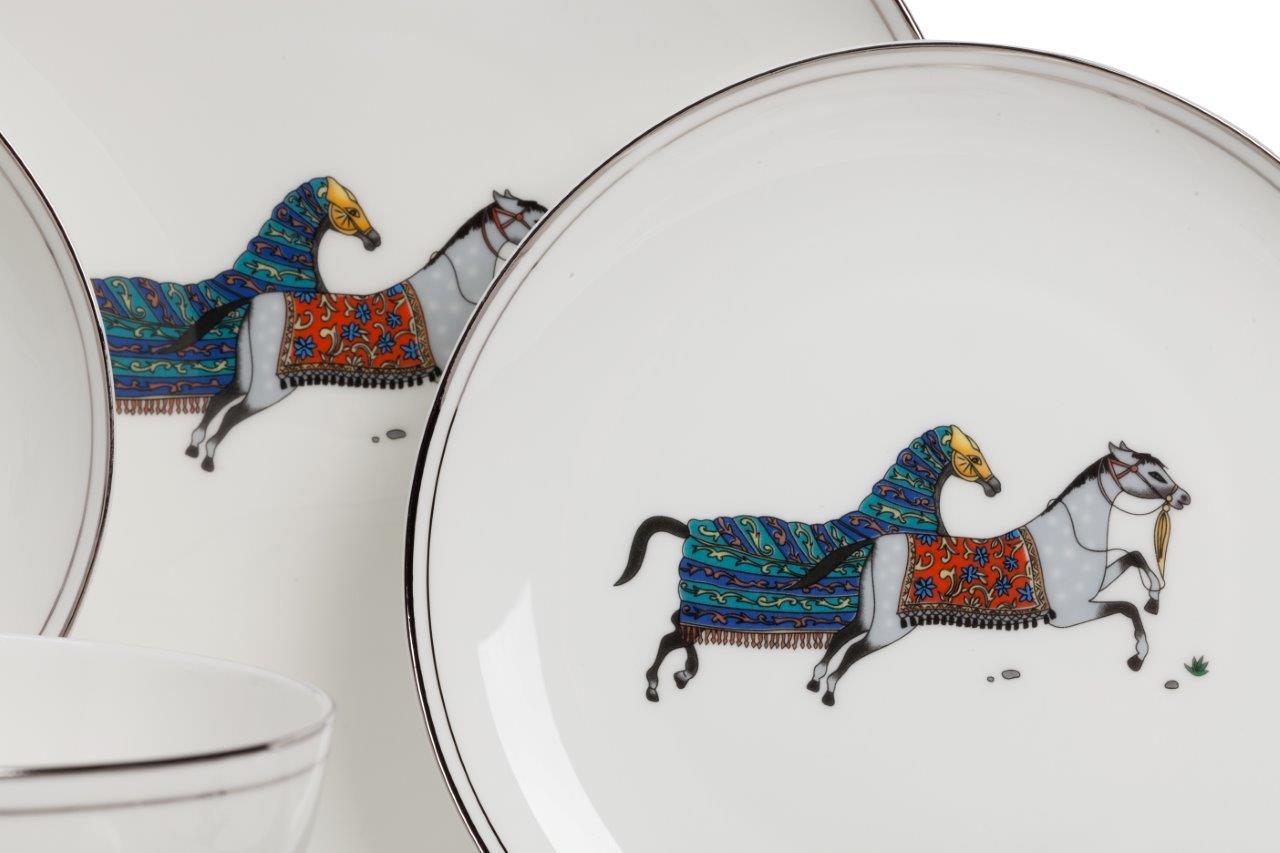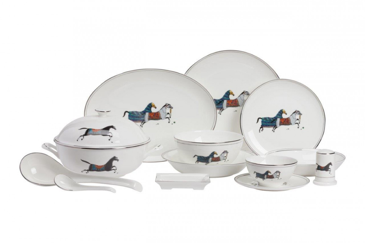 Столовый сервиз Javier выполнен из великолепного фарфора в стиле ампир. Декором служит минимализированный рисунок, в виде скачущих лошадей, контрастно выделяющихся на белом фоне столовых предметов. Сервиз можно приобрести отдельно, а также совместно с другими предметами этой серии.