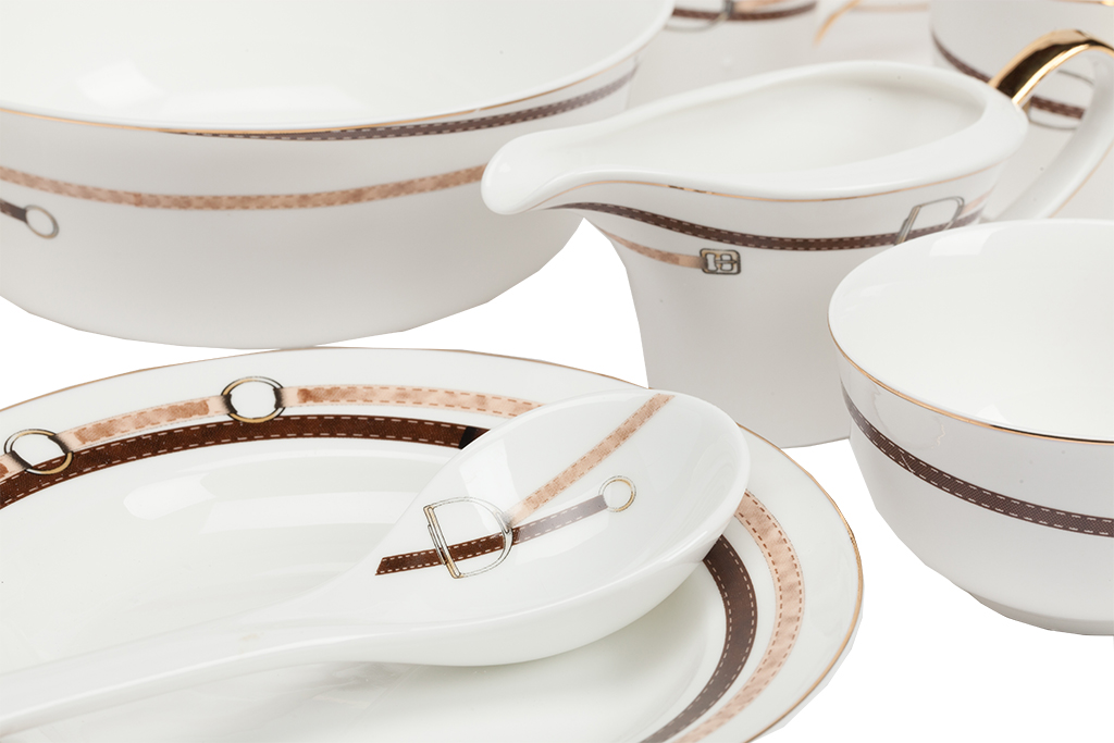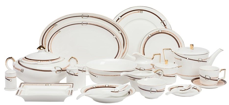 Элегантный столовый сервиз Loccita изготовлен из тончайшего костяного фарфора с оранжево-коричневой окантовкой. Для декорирования этого комплекта посуды дизайнеры избрали белый классический фон, разрисованный тонкими ремешками с заклёпками. Шикарный комплект включает практически весь набор посуды для сервировки застолья на 6 персон.