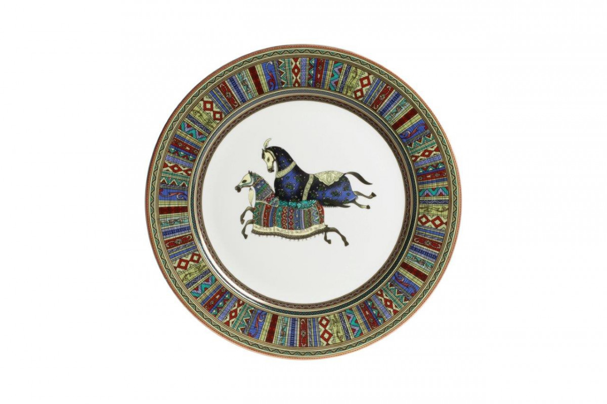 Блюдо Empire Sombre с многоцветной декоративной отделкой поверхности придется по вкусу любителям антикварных вещей. Такой элемент декора скажет о вас больше, чем вся обстановка в доме. Блюдо можно повесить на стену или поставить на полку буфета, оно везде будет смотреться эстетично и уместно. Отличительной особенностью блюда является многоцветное обрамление края узкой окантовкой в виде геометрического орнамента и скачущих сказочных лошадей в середине блюда. Блюдо можно приобрести отдельно, а также совместно с другими предметами коллекции Empire.