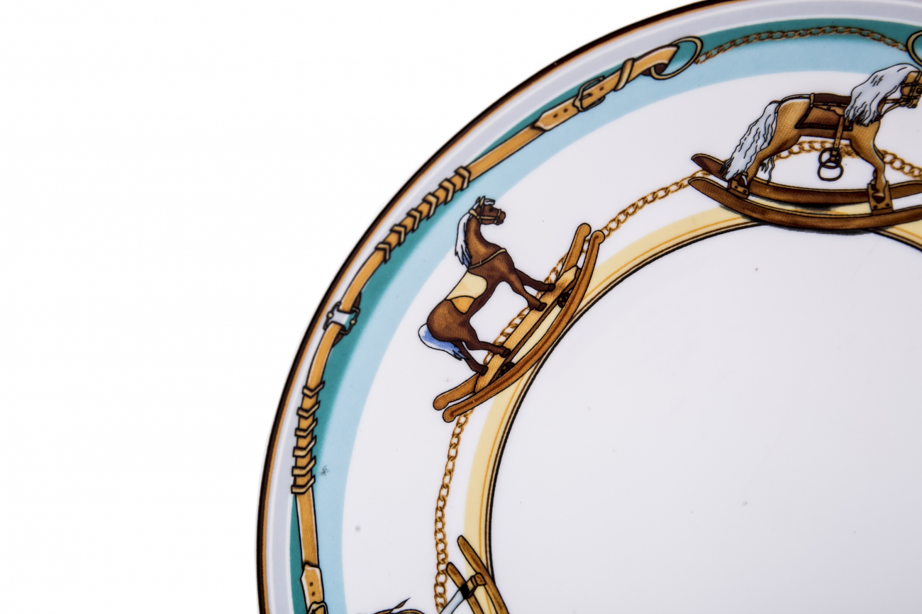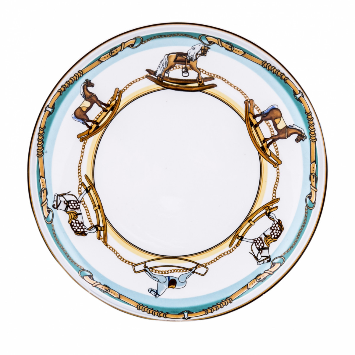 Тарелка диаметром 20,5 см выполнена из костяного фарфора. Тарелка расписаны в белом, голубом и оранжевом цвете с изображением игрушечных лошадок-качалок. Такая тарелка, конечно, заинтересует не только взрослых, но и детей. Купите ее в нашем интернет-магазине!