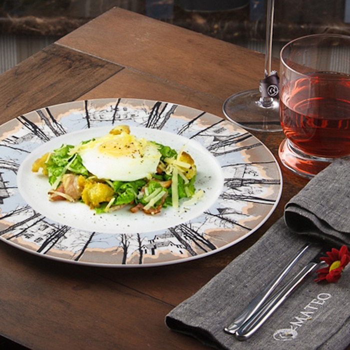 Коллекция состоит из сервировочного блюда, столовой и десертной тарелок.
