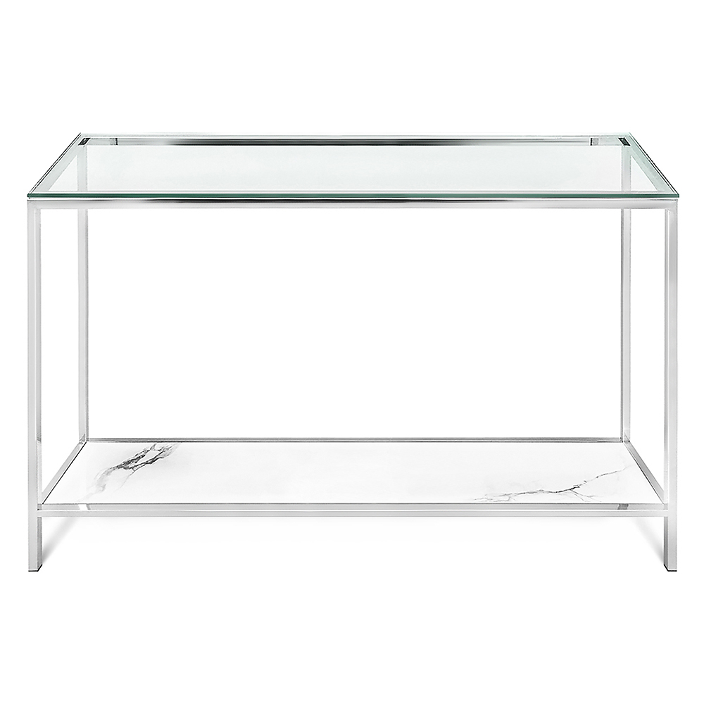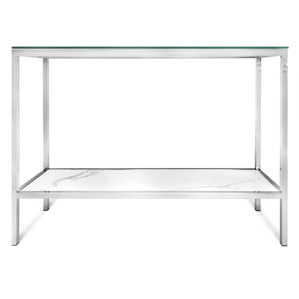 Преимущество данной консоли—два уровня поверхности: зеркальная и прозрачное, но прочное закалённое стекло, которое не бьётся и не трескается даже при сильном воздействии, не царапается и легко чистится от любых загрязнений. По желанию можно заменить зеркальную поверхность на каменную на выбор в белом и чёрном цвете.