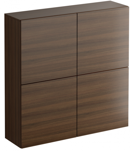 Фасад шкафа состоит из четырех распашных дверей, открывающихся по принципу «нажал-открыл». Шкаф имеет четыре отделения, в каждом отделении расположена съемная полка с возможностью переустановки по высоте. Задняя стенка черного цвета.