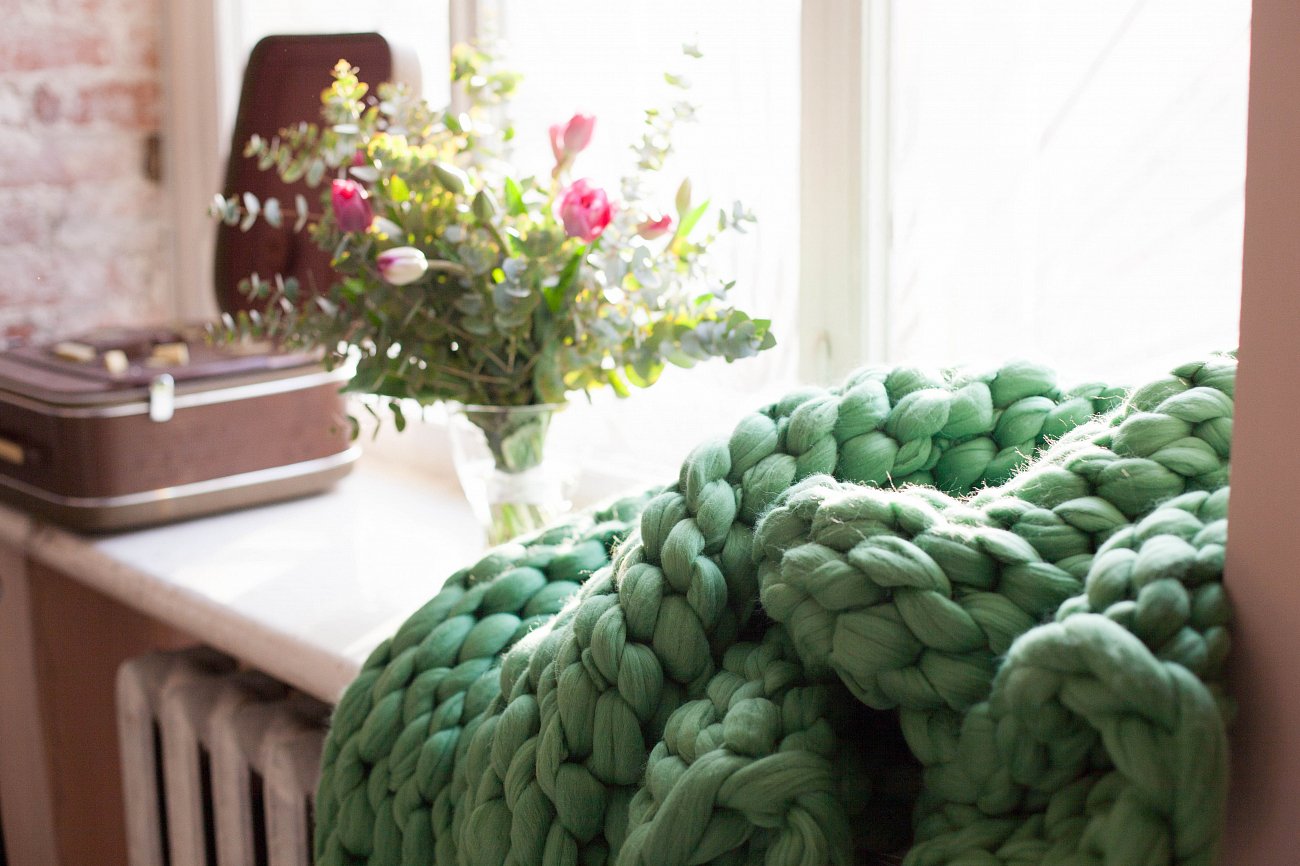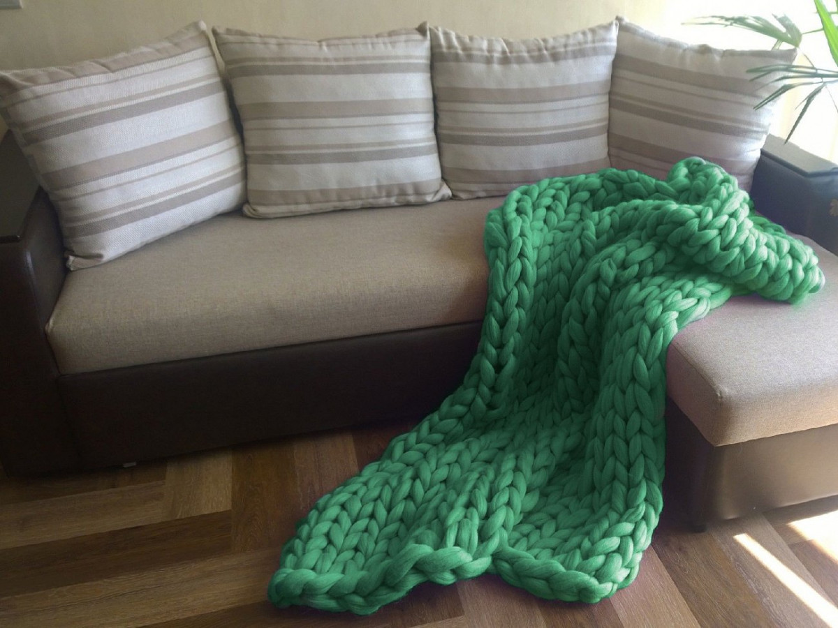 Плед крупной вязки изготовлен вручную из толстой пряжи, что делает изделие уникальным с эстетической точки зрения. Такой декор впишется в любой стиль интерьера.