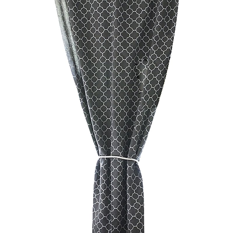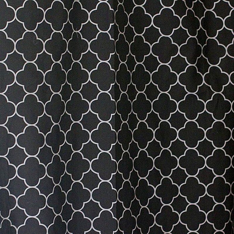 Две шторы из плотного темно-серого хлопка с белым принтом. Размеры: 130*250 см. Комплект из двух штор. Металлическая гарнитура. Пропускает 5-8 солнечного света